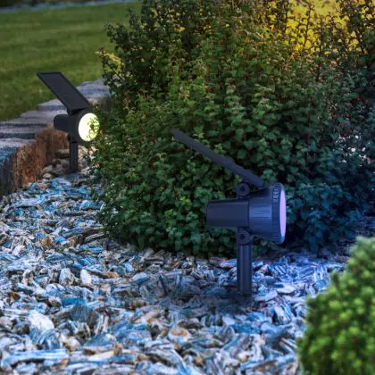 Die Solarleuchte kommt mit der Farbtemperatur 3000K - Warmweiß + RGB daher. Als Faustregel gilt: Je niedriger der Kelvinwert, desto gemütlicher wirkt das Licht.