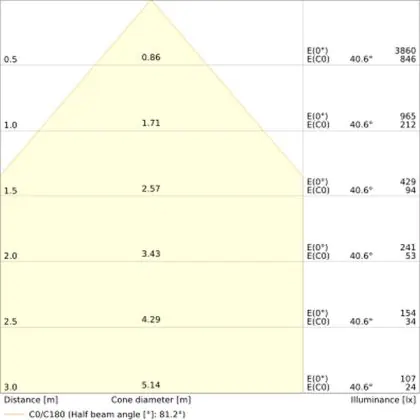 Beispiel: Wird eine Lampe mit einem Abstrahlwinkel von 60 Grad an der Decke (2,5 m Höhe) angebracht, erzeugt sie einen Lichtkegel von 2,9 Metern Durchmesser. Hat die Lampe hingegen einen Abstrahlwinkel von 120 Grad, beträgt der Lichtkegel 8,7 Meter im Durchmesser. |