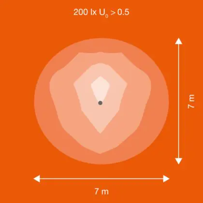 Beispiel: Wird eine Lampe mit einem Abstrahlwinkel von 60 Grad an der Decke (2,5 m Höhe) angebracht, erzeugt sie einen Lichtkegel von 2,9 Metern Durchmesser. Hat die Lampe hingegen einen Abstrahlwinkel von 120 Grad, beträgt der Lichtkegel 8,7 Meter im Durchmesser. |