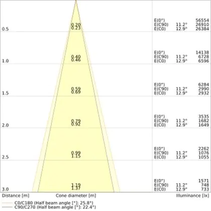 Beispiel: Wird eine Lampe mit einem Abstrahlwinkel von 60 Grad an der Decke (2,5 m Höhe) angebracht, erzeugt sie einen Lichtkegel von 2,9 Metern Durchmesser. Hat die Lampe hingegen einen Abstrahlwinkel von 120 Grad, beträgt der Lichtkegel 8,7 Meter im Durchmesser. |