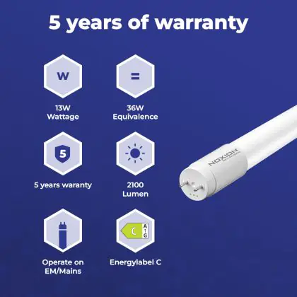 Die T8 LED-Röhre von Noxion kann nicht nur mit einer langen Lebensdauer von 50000 Stunden, sondern auch mit einer hohen Lumeneffizienz von lm/W überzeugen. Sie strahlt ihr Licht in der Farbtemperatur 4000K - Kaltweiß aus und wird mit betrieben. Im Preis ist zudem eine All-In-Garantie von 5 Jahre Jahren enthalten.