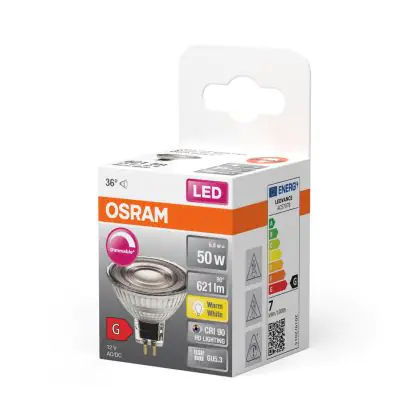 Die Osram LED Superstar Reflektor Spot GU5.3 MR16 6.8W 621lm 36D - 927 Extra Warmweiß | Höchste Farbwiedergabe - Dimmbar - Ersatz Für 50W ist eine effiziente GU5.3 LED-Lampe und der perfekte Ersatz für Ihre konventionelle Halogenlampe mit 50W und einem GU5.3-Sockel, bei dem die beiden Stifte einen Abstand von 5,3 mm zueinander haben. Die Abkürzung MR16 zeigt Ihnen, dass der Reflektor einen Durchmesser von 5 cm hat. Zudem strahlt das Produkt Licht in der Farbtemperatur 2700K - Extra Warmweiß aus und punktet durch eine lange Lebensdauer.