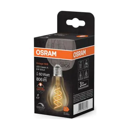 Die Osram Vintage 1906 LED Classic Slim E27 Birne Fadenlampe Gold 8W 806lm - 922 Extra Warmweiß | Höchste Farbwiedergabe - Dimmbar - Ersatz Für 60W ist eine effiziente E27 LED-Lampe mit Retrodesign und der perfekte Ersatz für Ihre konventionellen 60W Lampen mit E27. Zudem strahlt sie Licht in der Farbtemperatur 2200K - Extra Warmweiß aus und punktet durch eine lange Lebensdauer.