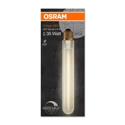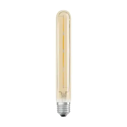 Die Osram Vintage 1906 LED E27 Tubular 4.5W 824 Gold | Dimmbar - Ersetzt 35W ist eine moderne LED-Lampe mit Vintage-Design. Sie kann ganz einfach herkömmliche Leuchten mit einem E27-Sockel, sowie einem Verbrauch von 35 Watt, ersetzen und ermöglicht damit eine Energieersparnis von bis zu 90 %. Zudem punktet die Lampe mit einer langen Lebensdauer, leuchtet in der Farbtemperatur extra Warmweiß und besitzt einen Leuchtkörper aus Glas in der Gold-Ausführung. Des weiteren ist die Vintage-LED dimmbar.