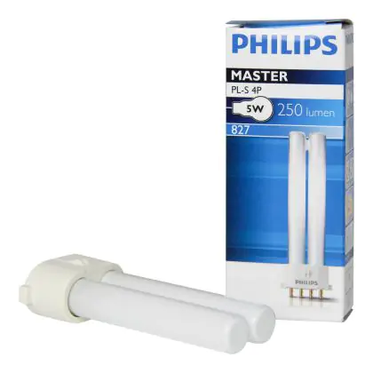 Philips PL-S 4P sind Leuchtstofflampen mit separater Stromversorgung und kompatibel mit konventionellen und ferromagnetischen Vorschaltgeräten. Diese Lampen sind mit einem 4-Pin-Sockel ausgestattet. Mit einer Länge von 89mm, besitzen die Philips PL-S 5W 827 4P einen 2G7 Lampensockel mit 4 Pins.